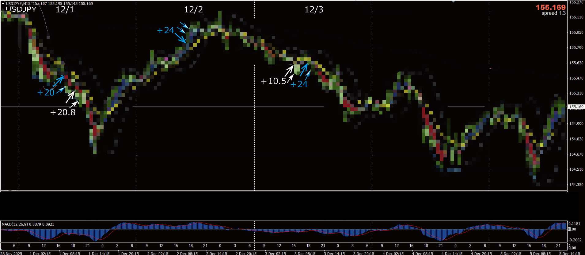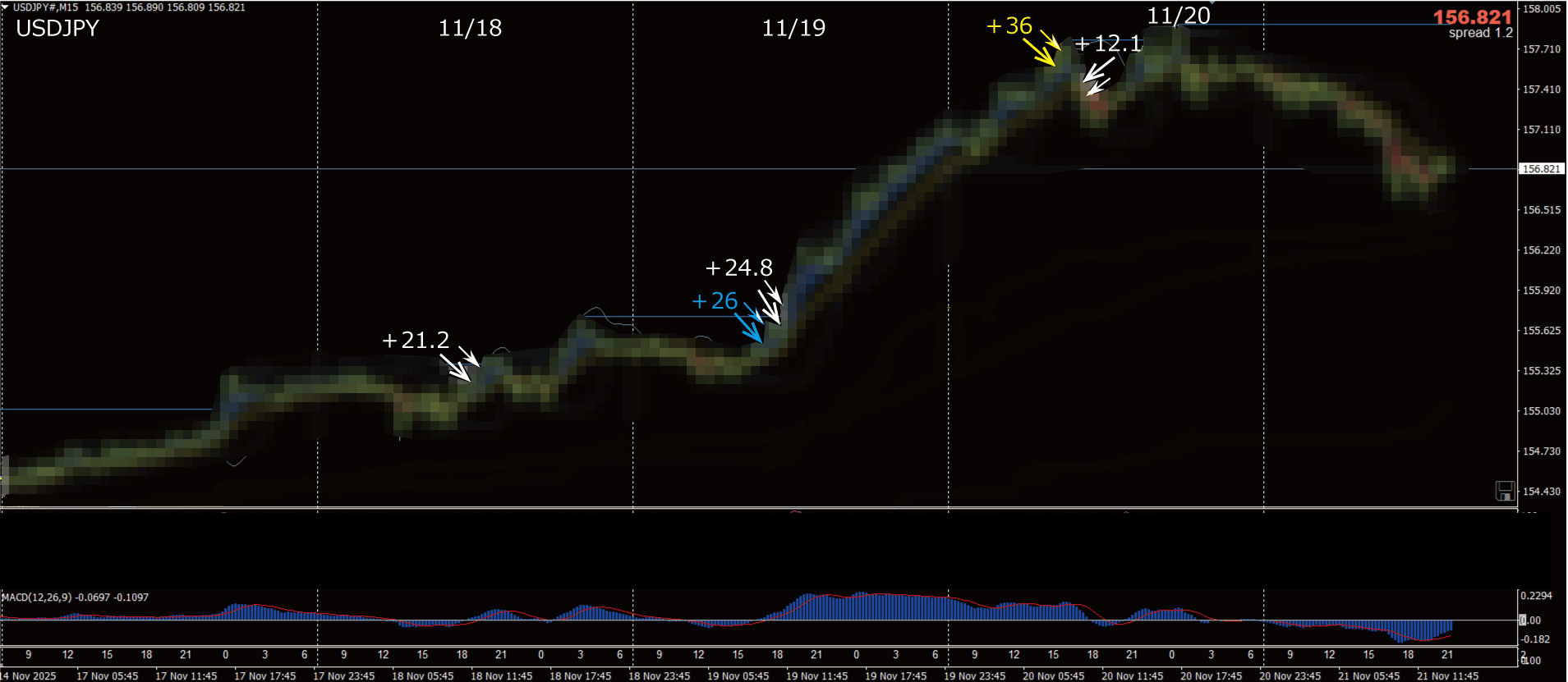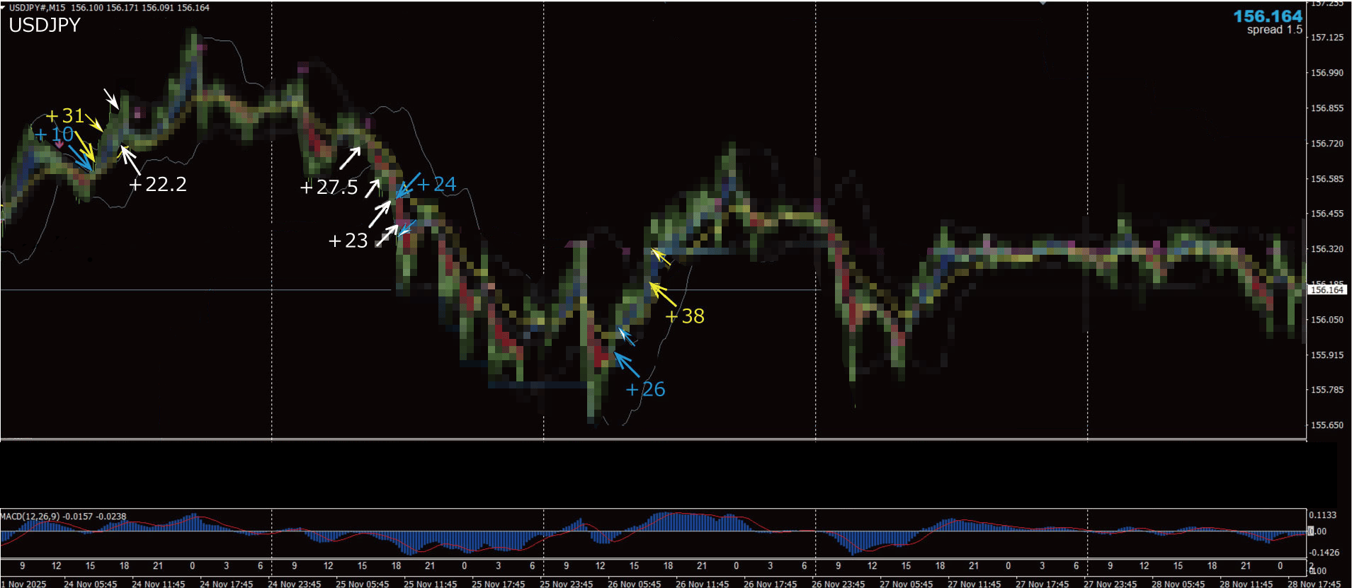 この場合、色分けされている3人のエントリーと決済箇所がチャートに記されています。