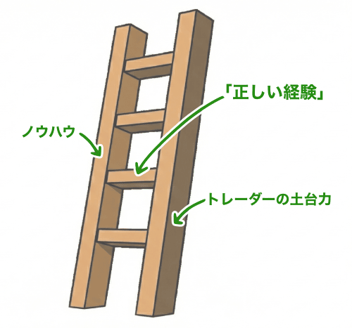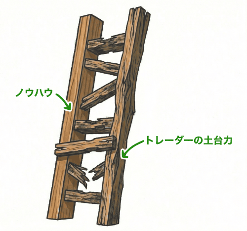 しかしもう一方のハシゴの部品である『トレーダーとしての土台力』がスカスカだと、どれだけ良い手法を学んでも不安定なままなんです。