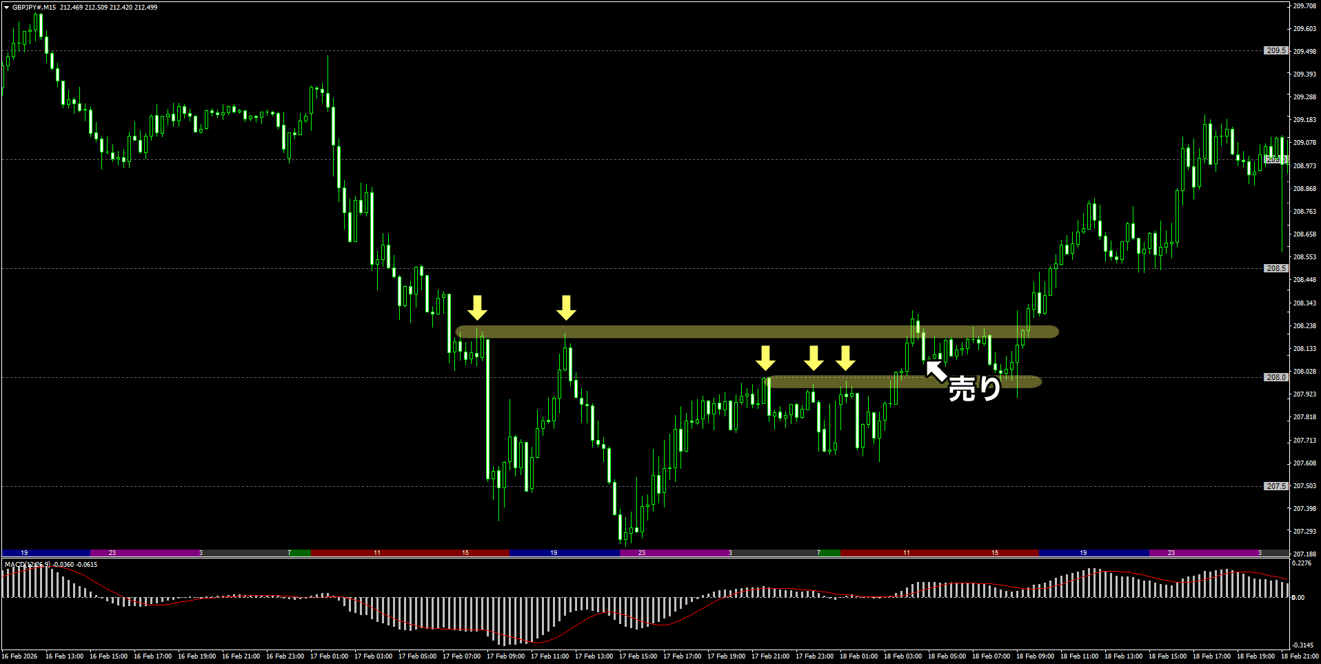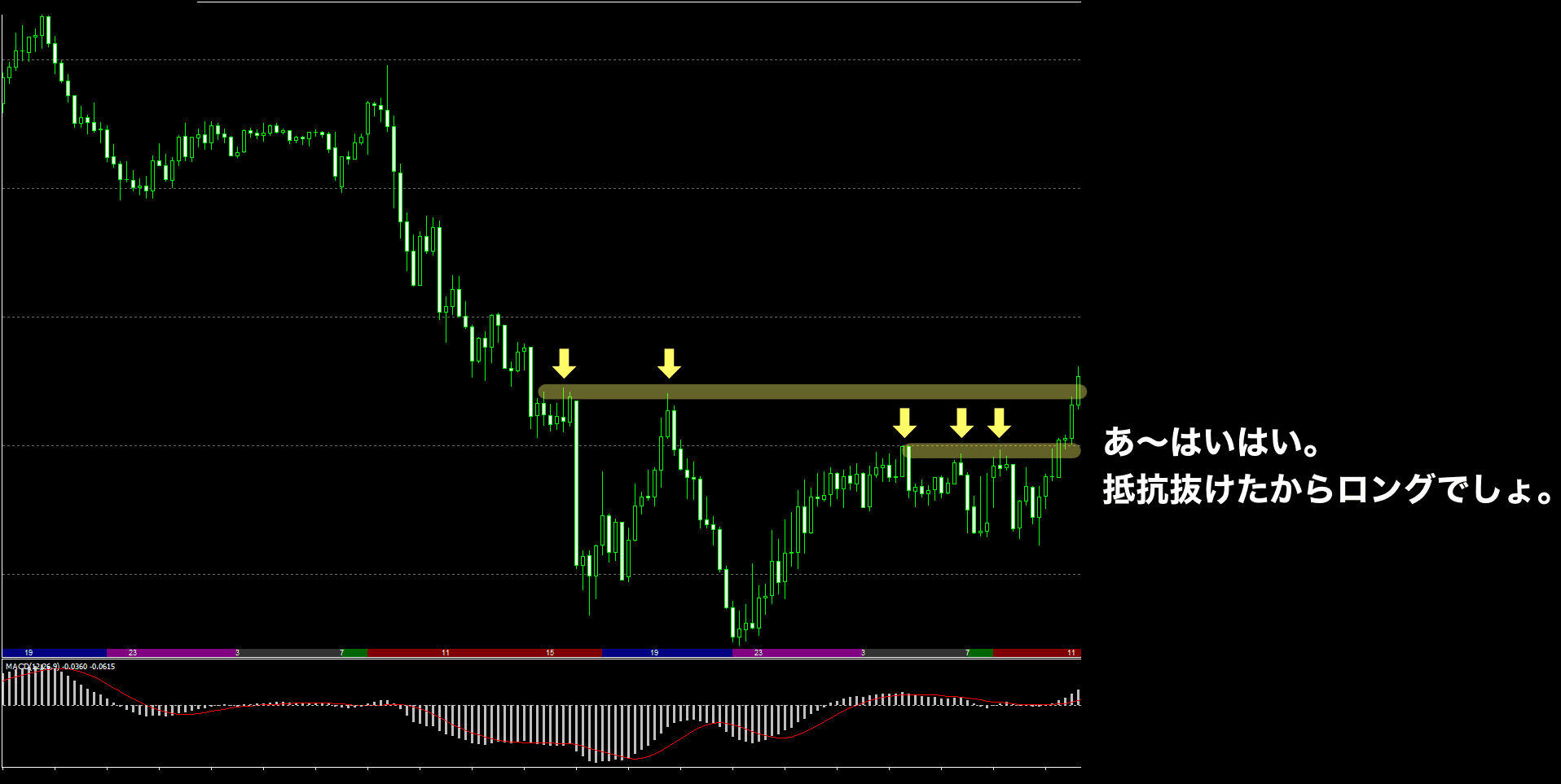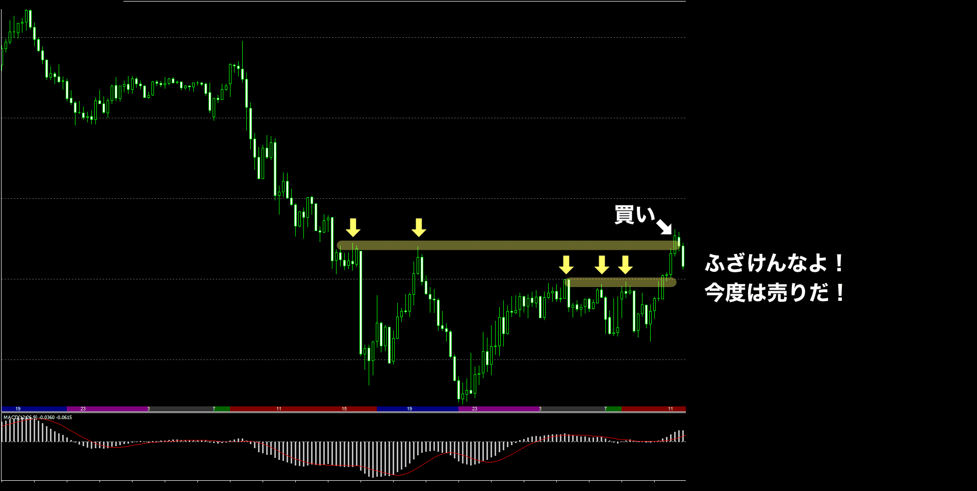 仮にさっきのような底値のレンジで売っていたとしても、上記のようにチャートを読めているなら黄色を抜ければ目線を変える「ドテン」もできます。