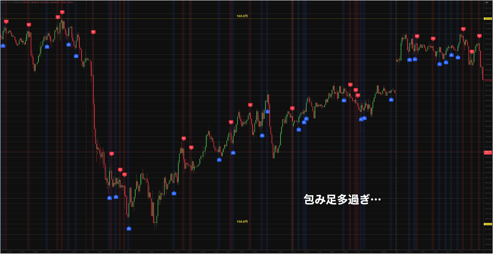 もちろんこうした背景を加味しても勝率100%にはなりませんが、包み足がダマシだった場合に『ドテンでついて行く』という選択肢も持てるようになるので、自分なりにでも背景を考えたシナリオ構築が大切です。