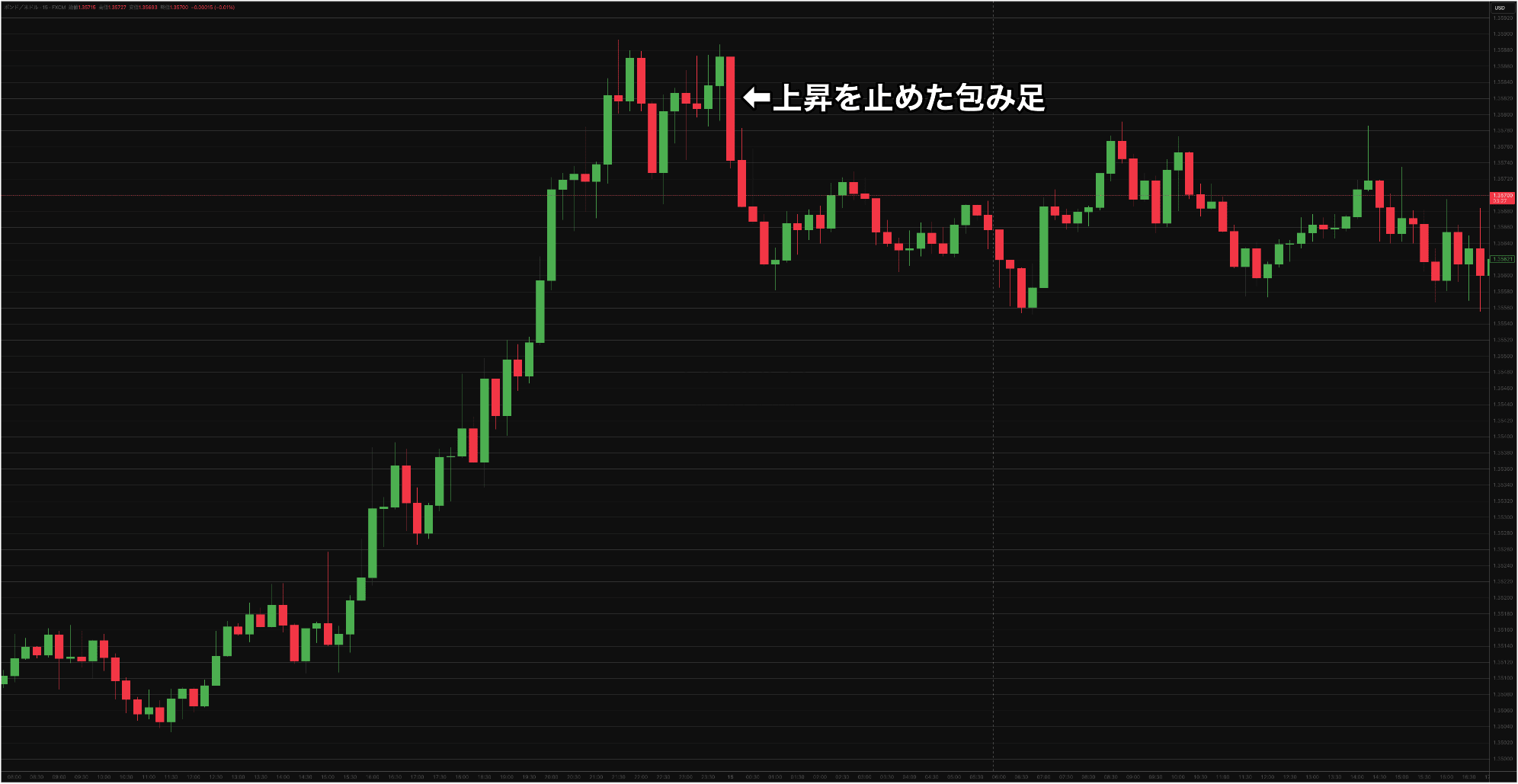 先ほどのポンドドルの4時間足を見ると、節目での攻防の末に出現した包み足であることがわかります。