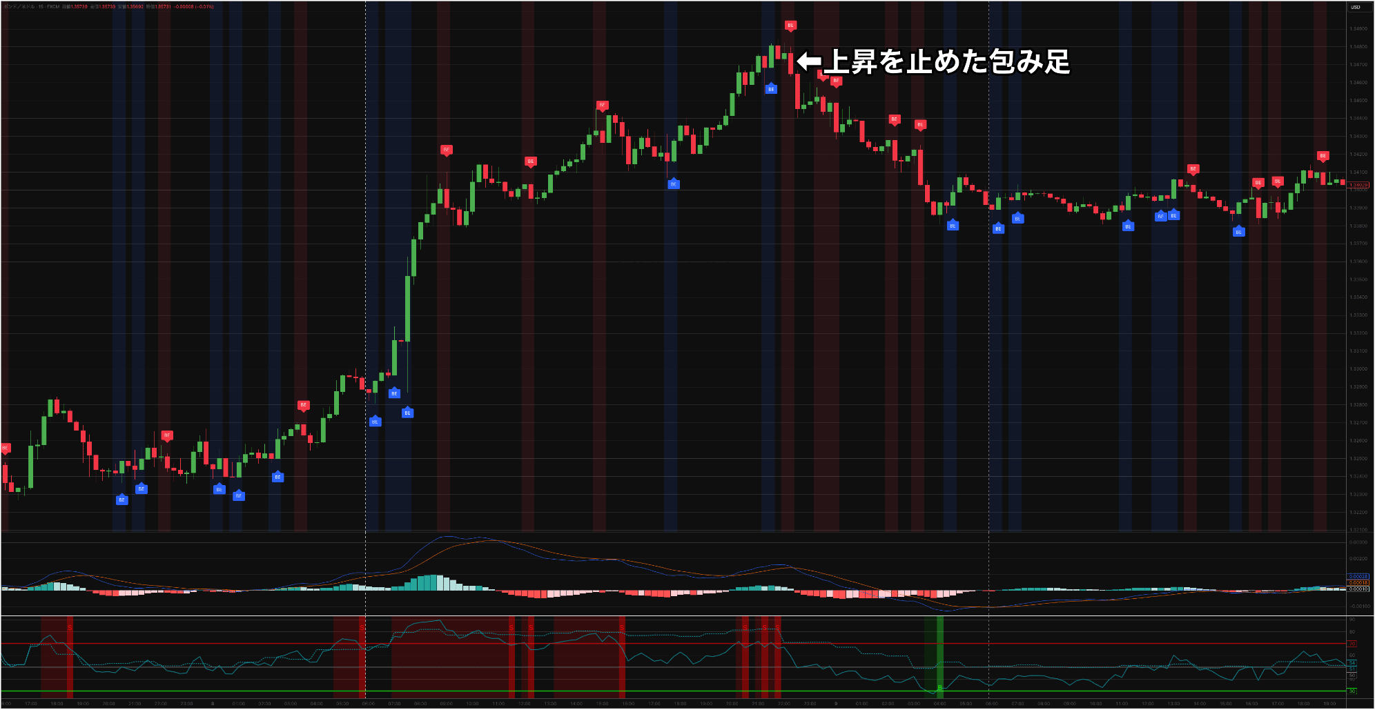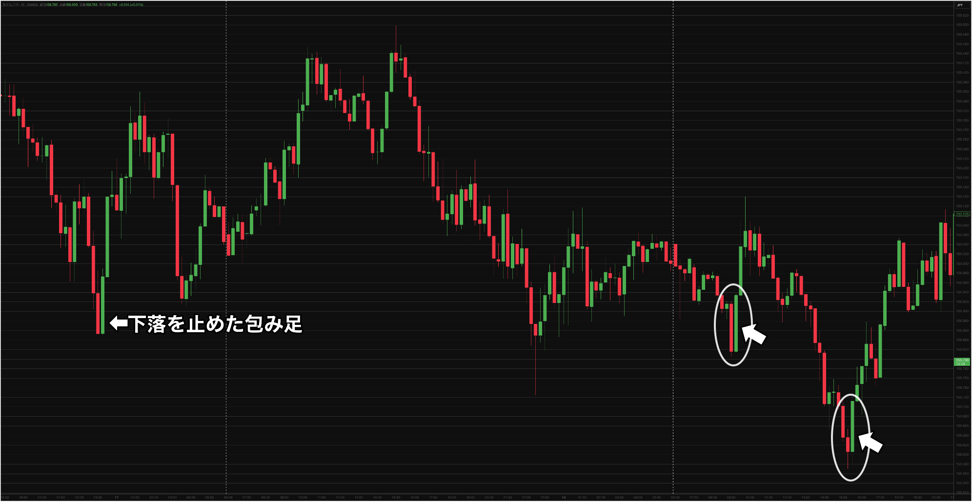 以下に解説するテクニカル的なポイントだけではなく、こうした値動きの背景を加味することが最強の包み足を見分けるポイントとなります。