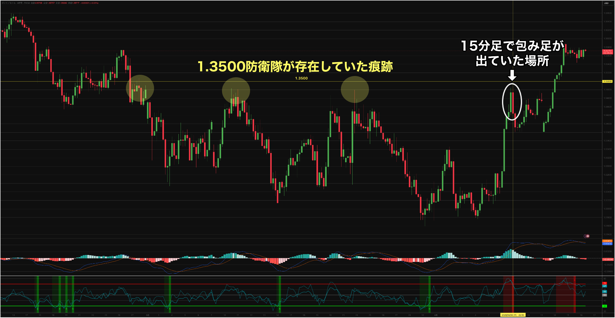 明らかに1.3500防衛隊が出動して上を押さえている様子がわかります。