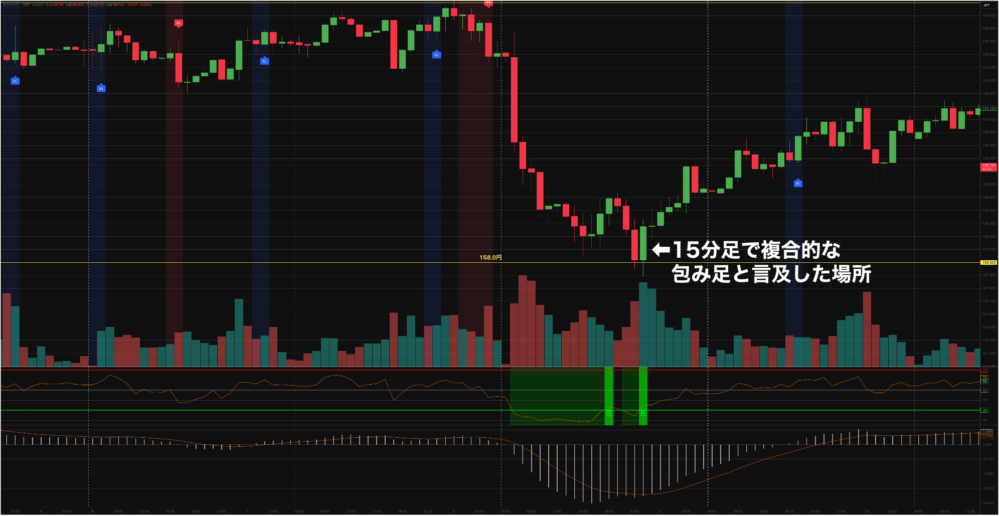 それに対して右側の四角部分は、15分足で包み足にはなっていませんが複合的に捉えると反発を示唆する形としてGoodな状態です。