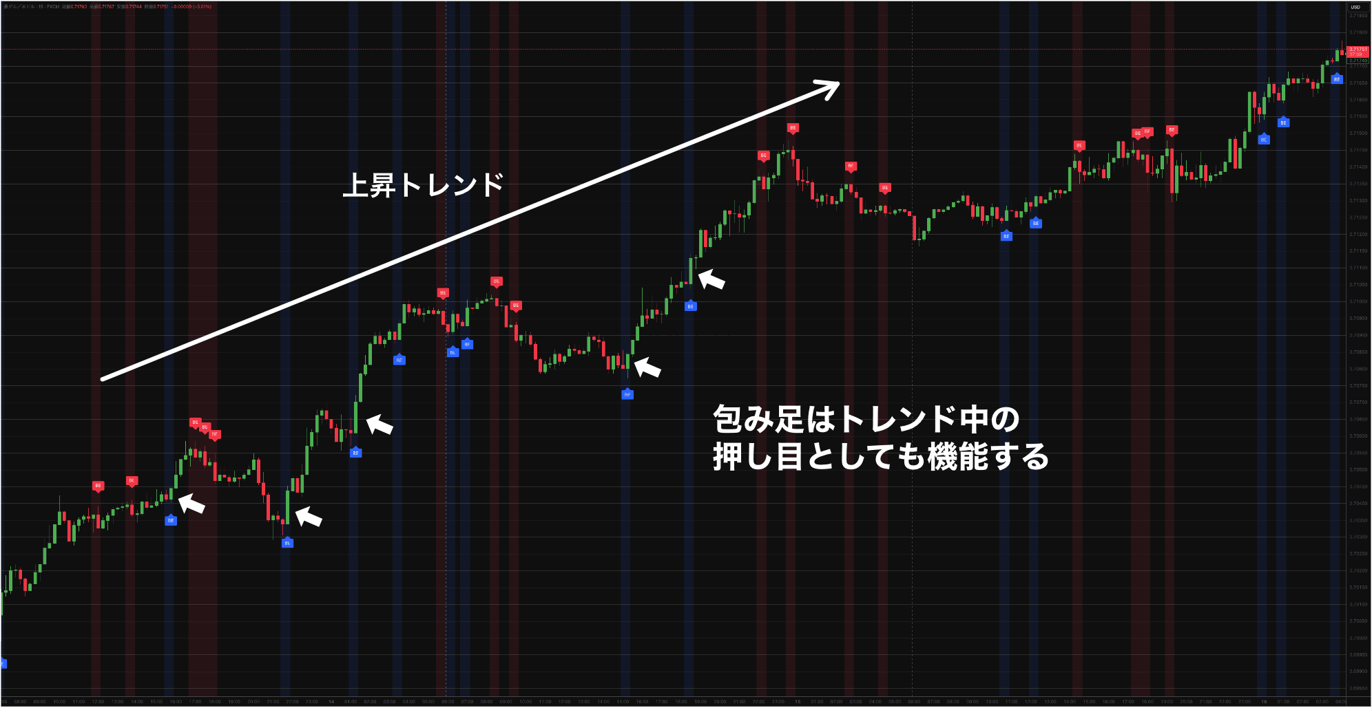 あと、包み足は反転を狙うだけじゃなくて、トレンド中の押しや戻りを捉える使い方も有効です。